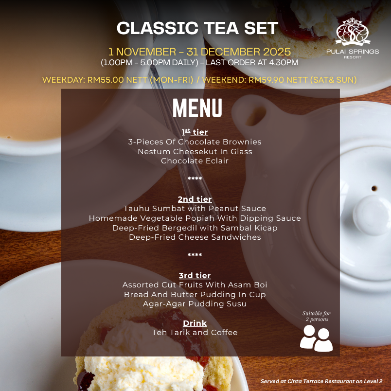 Classic Tea Set, perfectly crafted for two. Enjoy a delightful selection of comforting local favourites and sweet treats as you soak in the peaceful poolside atmosphere at