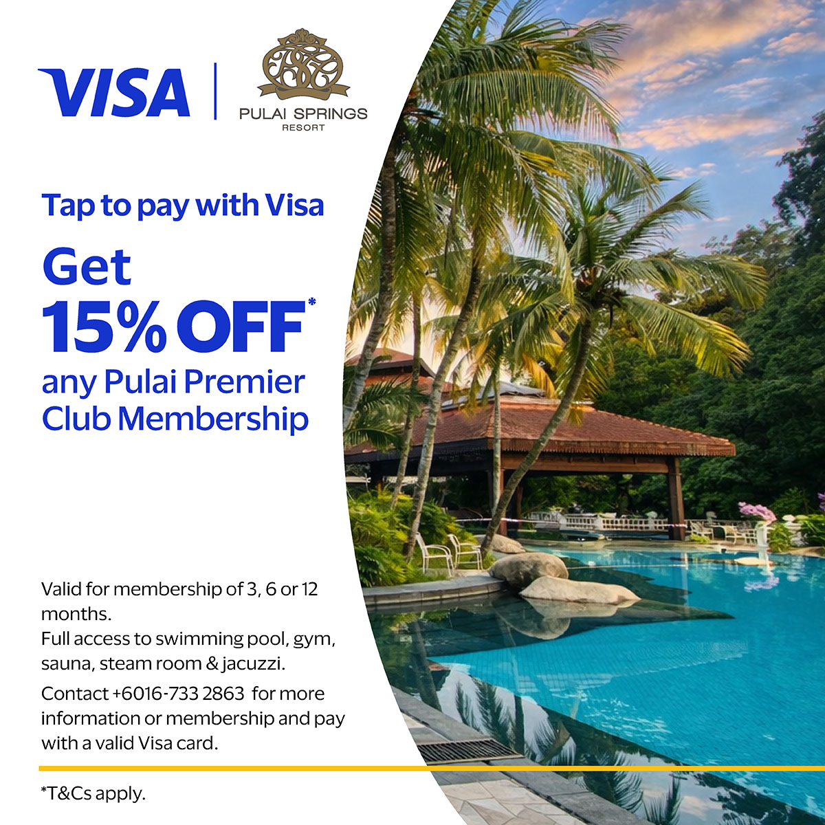 Get 15% OFF Pulai Springs Term Membership (Pulai Premier Club Membership) when you pay with a valid Visa Card (3 months, 6 months and 1 year term membership)
